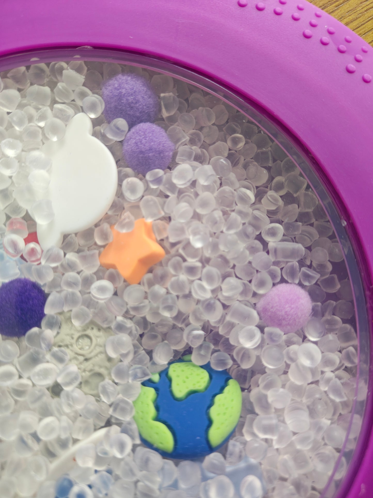 Crafted with a silicone exterior with plastic window and filled with figures and weighted beads for little ones to move around and discover whats inside,