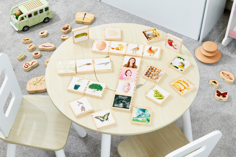 24 smooth birch plywood square tiles, clearly colour printed on one side with real photographic lifecycle images. Showing 4 stages for each lifecycle, the self-correcting tiles illustrate the growing and development process of humans, bees, frogs, apples, butterflies and chickens.
