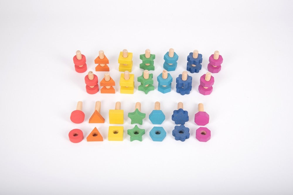 Beautiful solid beechwood nuts and bolts in seven different shapes and in the seven colours of the rainbow. Each nut has a corresponding matching bolt for pairing by colour and shape, and each shape has a different number of edges. The chunky pieces are the ideal size for young children to manipulate and come in a natural finish to show the grain of the wood. Perfect for learning about colour and shape, for supporting counting and early numeracy, as well as improving manual dexterity and fine motor strength. Includes cotton bag.