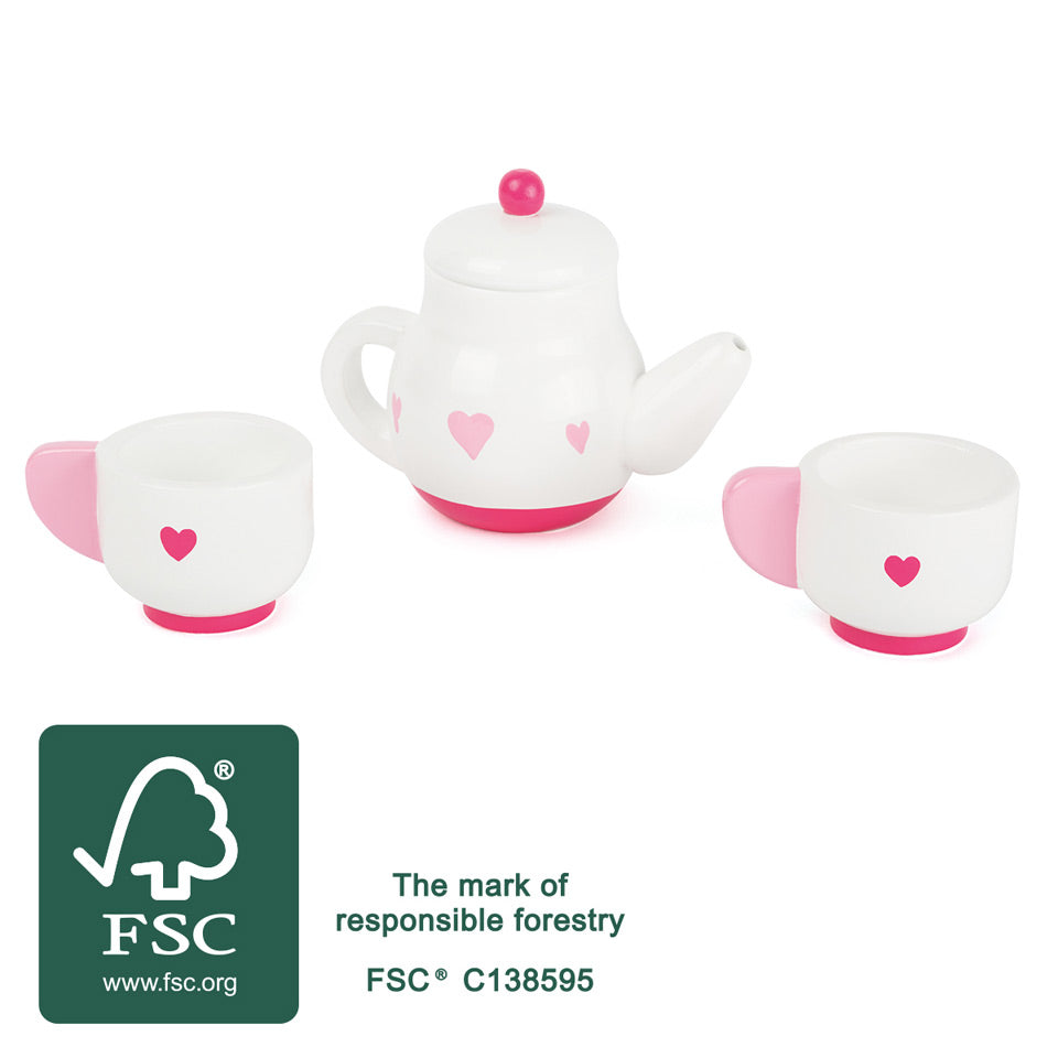 Whether for a coffee party or tea time - this tea set made of lacquered wood is a dream for every doll´s mother! The small teapot with the removable lid is decorated with small pink hearts and matches the two included tea cups perfectly. This product is made of FSC® 100%-certified wood.