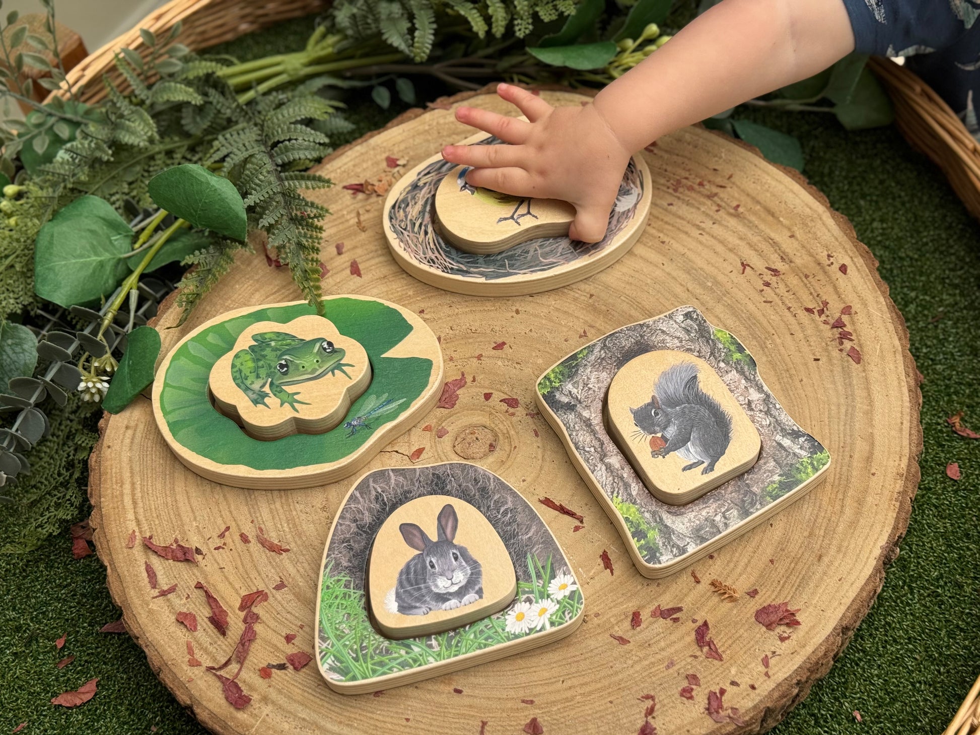 - Set four, 2-piece puzzles: Bird and nest, Frog and lily pad, Rabbit and burrow, Squirrel and tree